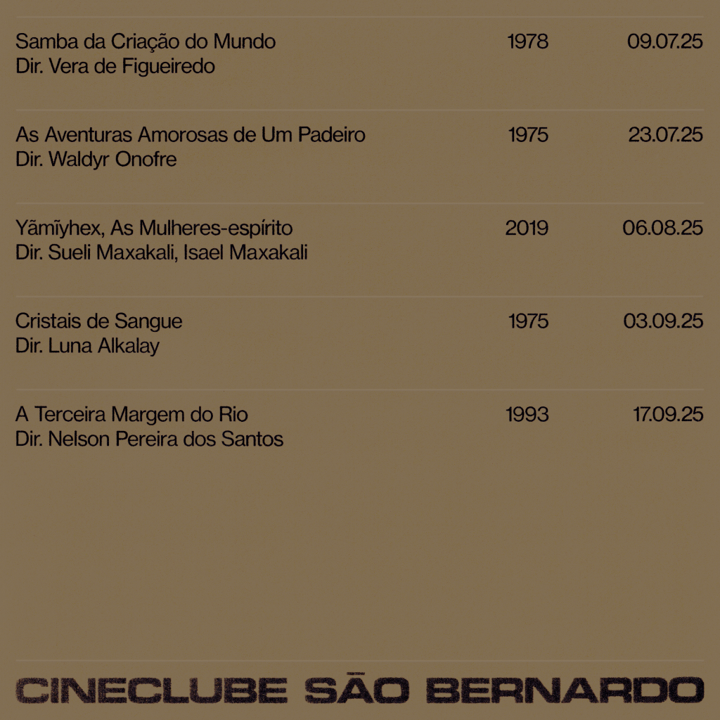 Se no primeiro ciclo deste ano partimos do real para pensar a forma com que o cinema brasileiro lida com uma ideia de país, aqui esse real é encantado pelos olhos do espírito, tornando-se metafísica, dança, cor e ritual. “Samba da Criação do Mundo” abre alas para esse novo momento, a partir da música e do mito da criação Nagô. Com os signos das religiões afro-brasileiras e da comédia, os contornos da ficção voltam à tona a partir de “As Aventuras Amorosas de Um Padeiro”. “Yãmĩyhex, as Mulheres-Espírito” nos coloca próximos ao cinema-ritual de encenação e cores na Aldeia Verde Maxakali, em Minas Gerais, habitada e atravessada pelos ancestrais. Já nas exuberantes paisagens históricas da Chapada Diamantina, “Cristais de Sangue” nos apresenta um conto inebriante de família e posse. O caminho segue pela fantasia rumo ao cinema popular em uma obra pouco vista de um dos cineastas mais conhecidos de nosso cinema: “A Terceira Margem do Rio”, dirigido por Nelson Pereira dos Santos e baseado na literatura de Guimarães Rosa.